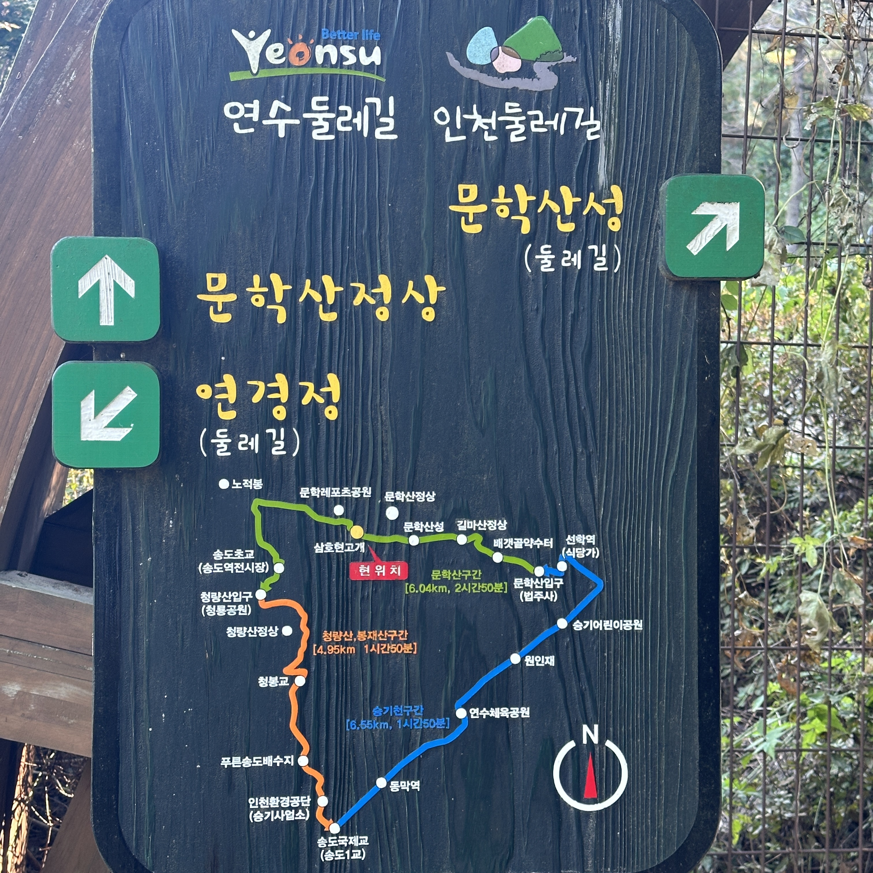 등산코스 : 선학경기장 > 문학산 > 연경정 > 송도역 > 청량산 > 봉재산 > 송도 센트럴파크 > 인천대학교 > 솔찬공원